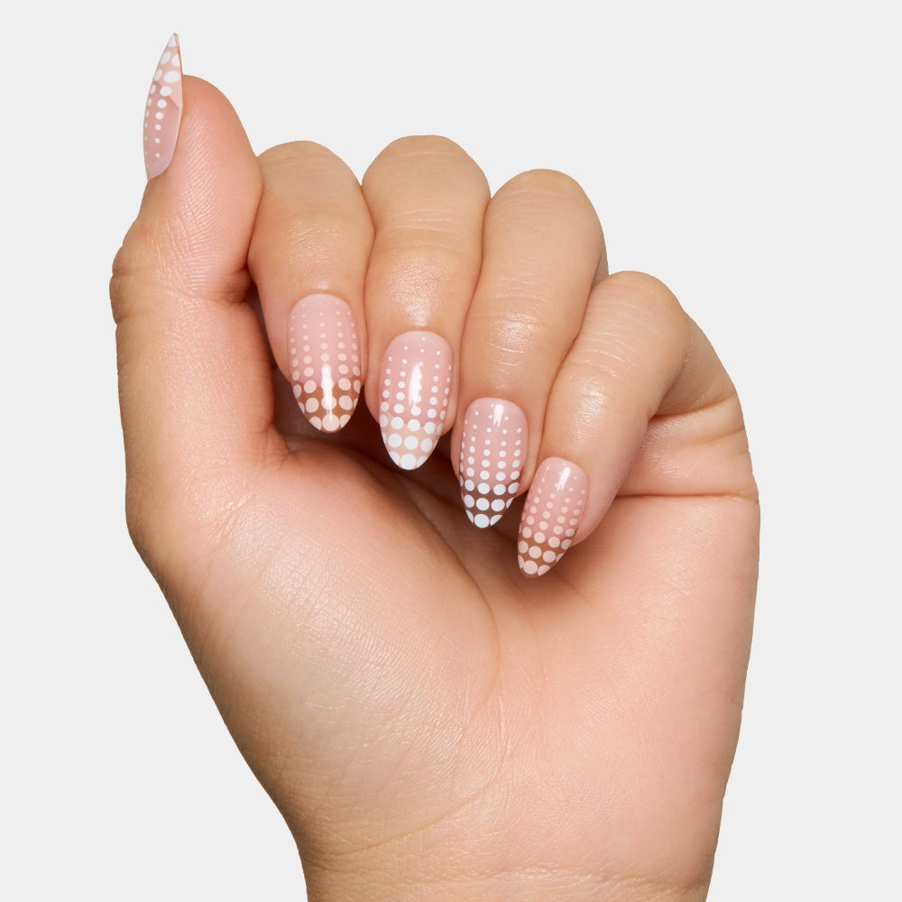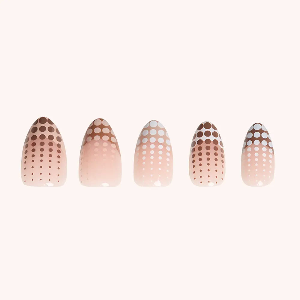 A true chaotic neutral. Our Spot On Press-On Nails dress up classic French tips with playful polka dots, echoing our Talk A Dot press-ons. Designed in nude but never boring, these short almond manis are always on point.