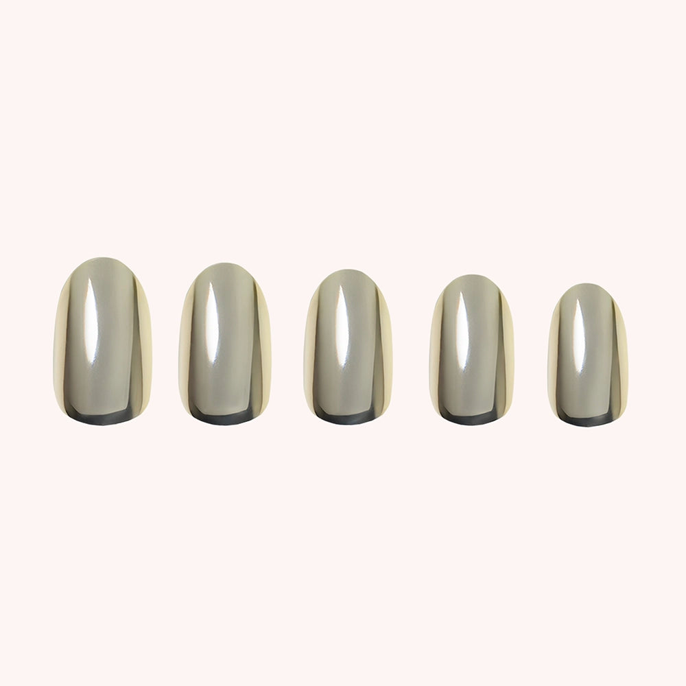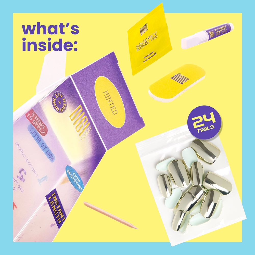 Now this is mint condition. Our Minted Press-On Nails take jewelry nails to a new level with sleek, mint green manis with a metallic, mirror-like finish (similar to our Ice Cold press-ons). It’s effortlessly cool in our short oval shape, with a quick, 5-minute application.