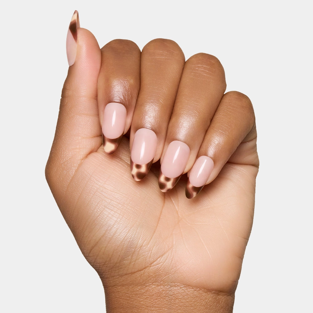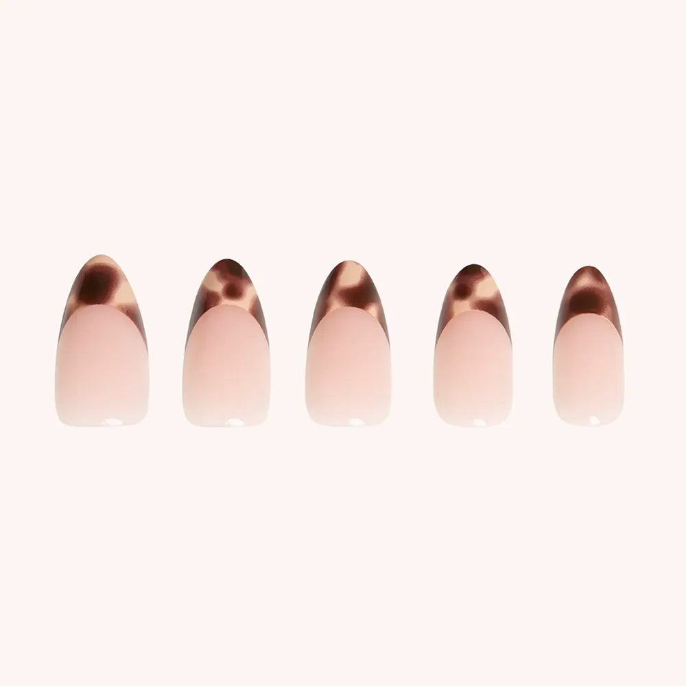 Not your average French tips. Our Moo! Press-On Nails will have you milking in all the compliments with brown cowprint French tips in a medium almond. Now that’s farm-fresh.
