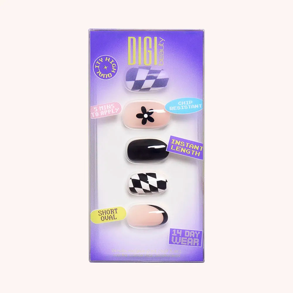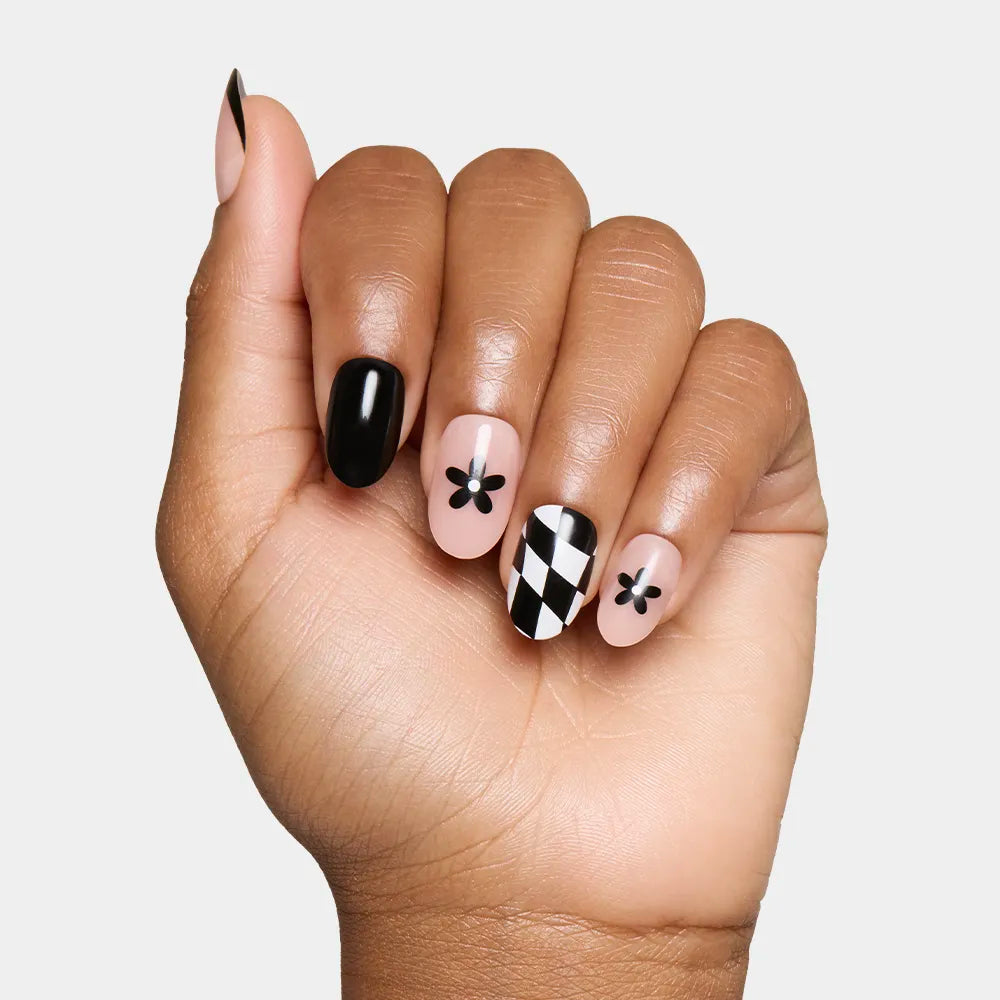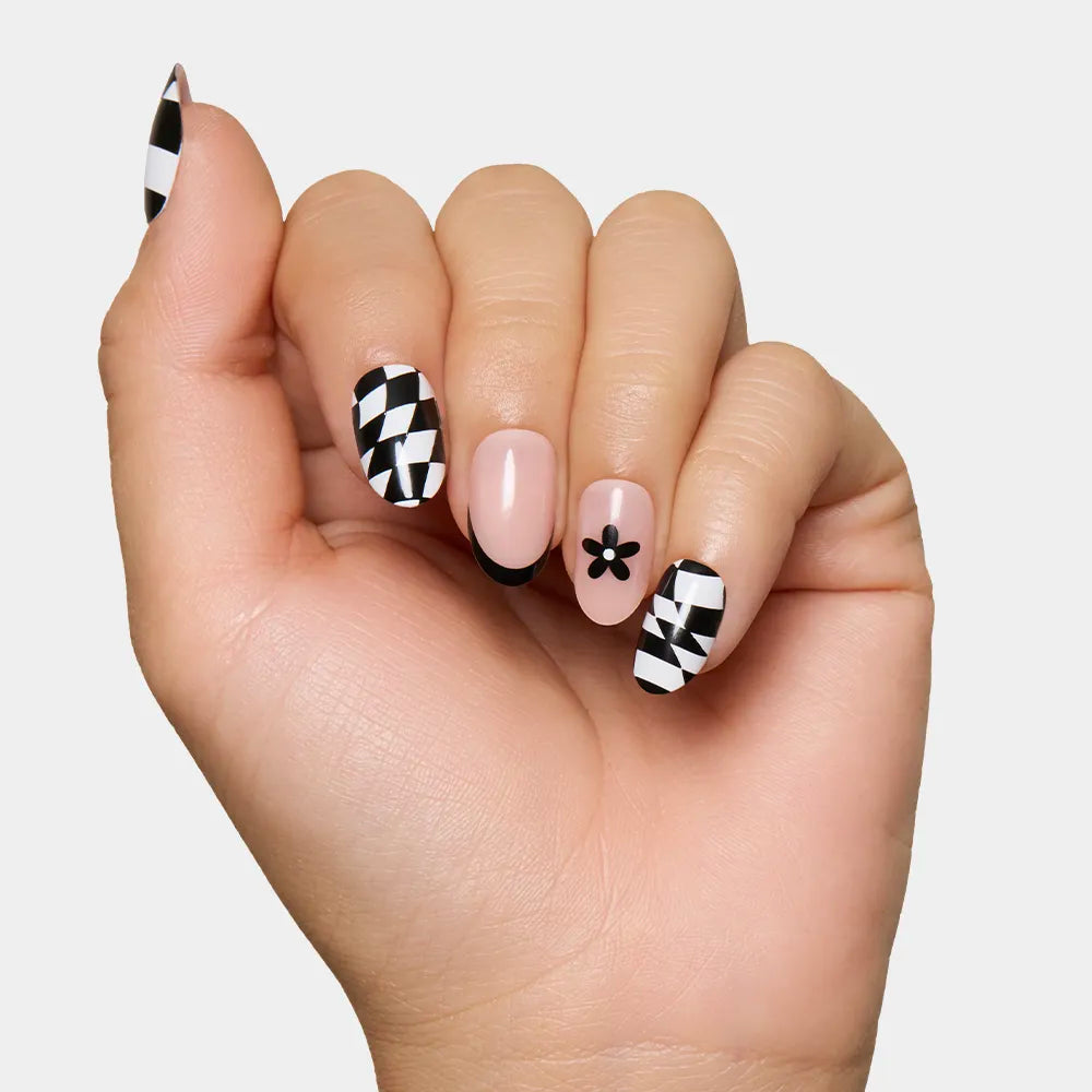 Anything but ordinary. Our French AF Press-On Nails are short oval manis, perfect for the wildcards who love to mix patterns. Decorate your digis with solid black nails, micro French tips, checker prints, and floral graphics for a look that’s totally you.